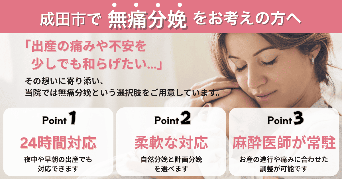24時間無痛分娩に対応しており、これまでも成田市にお住まいの妊婦さんにご来院いただいております。
