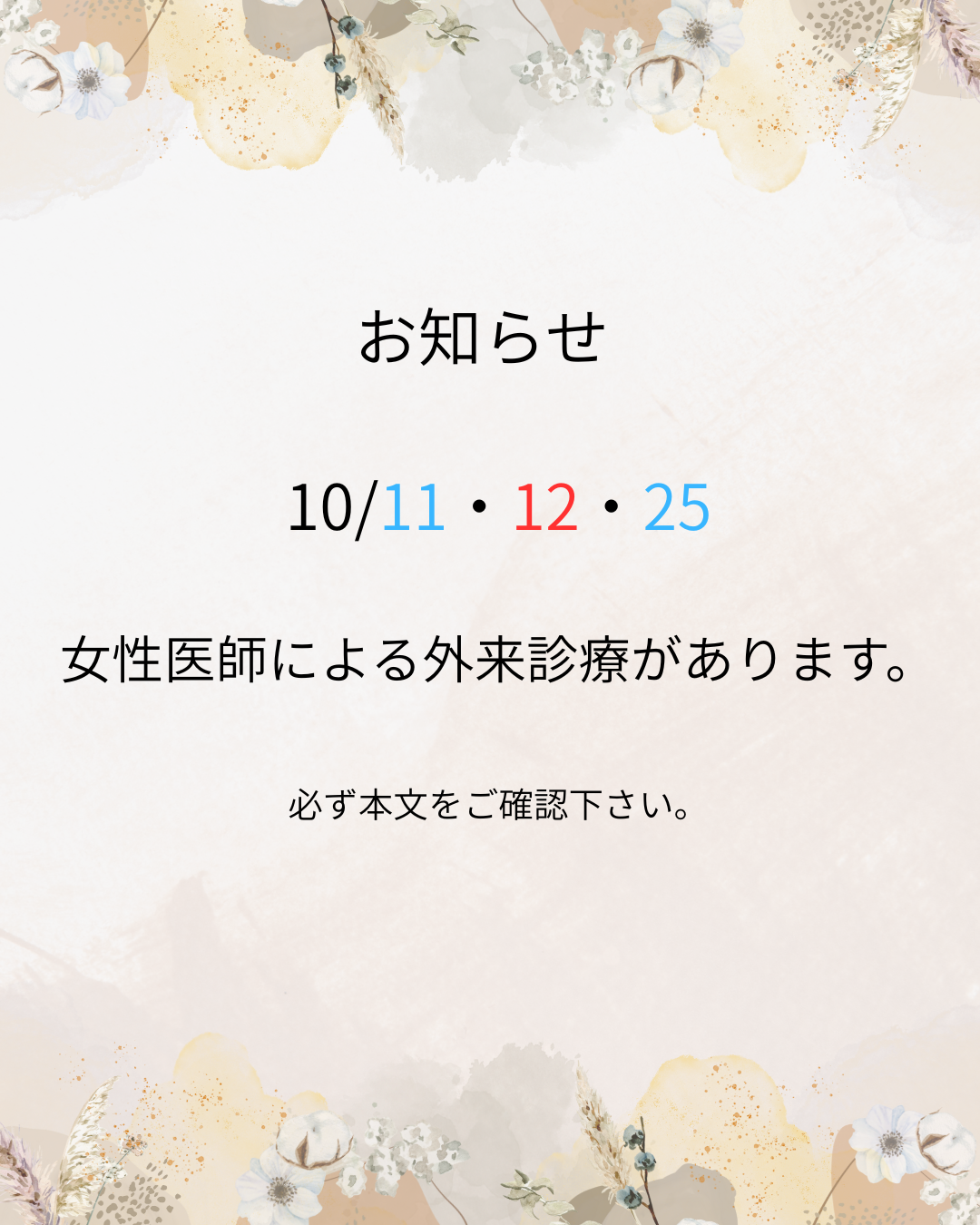 ※診療内容等により女性医師による診察が受けられない場合もございます。