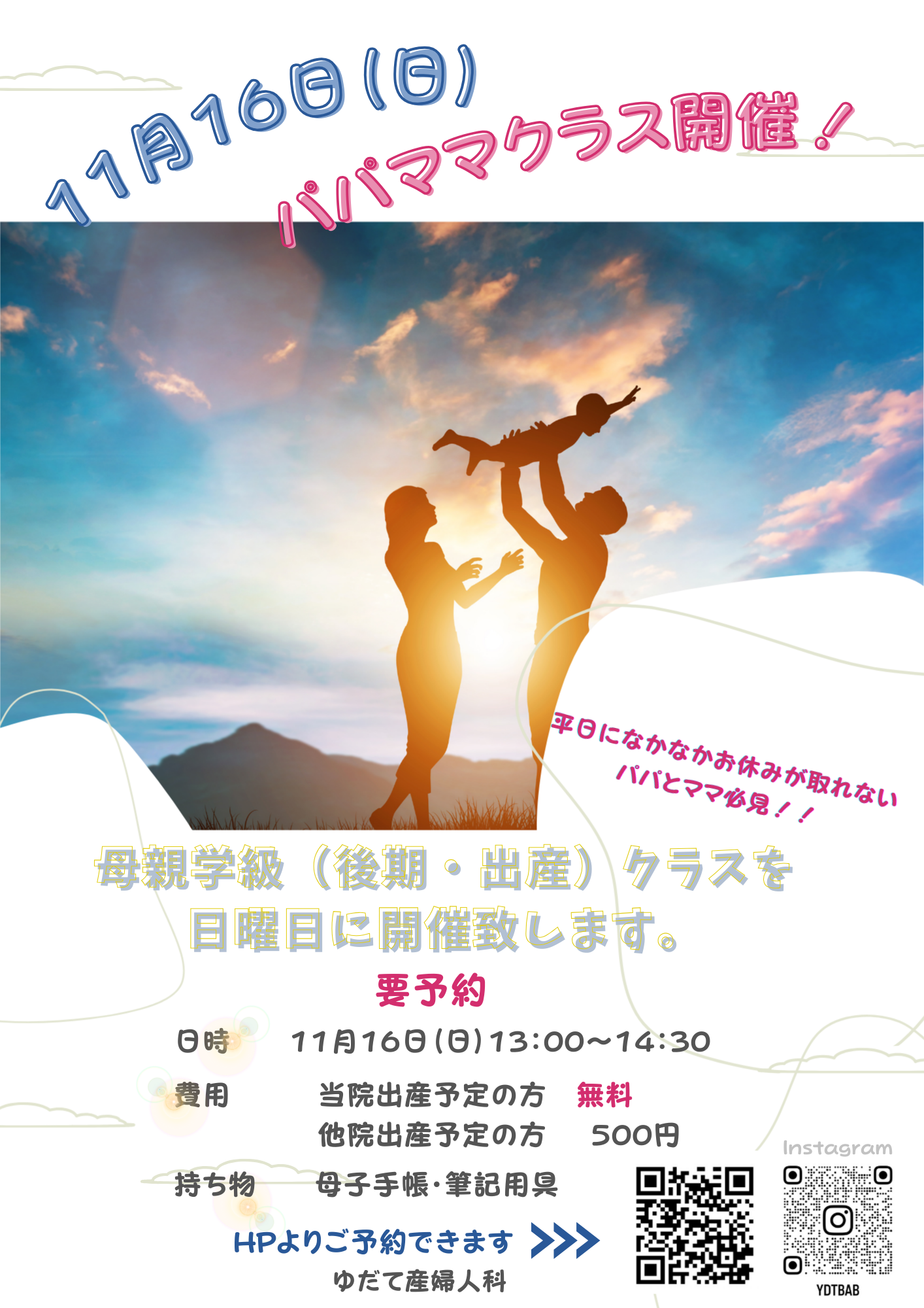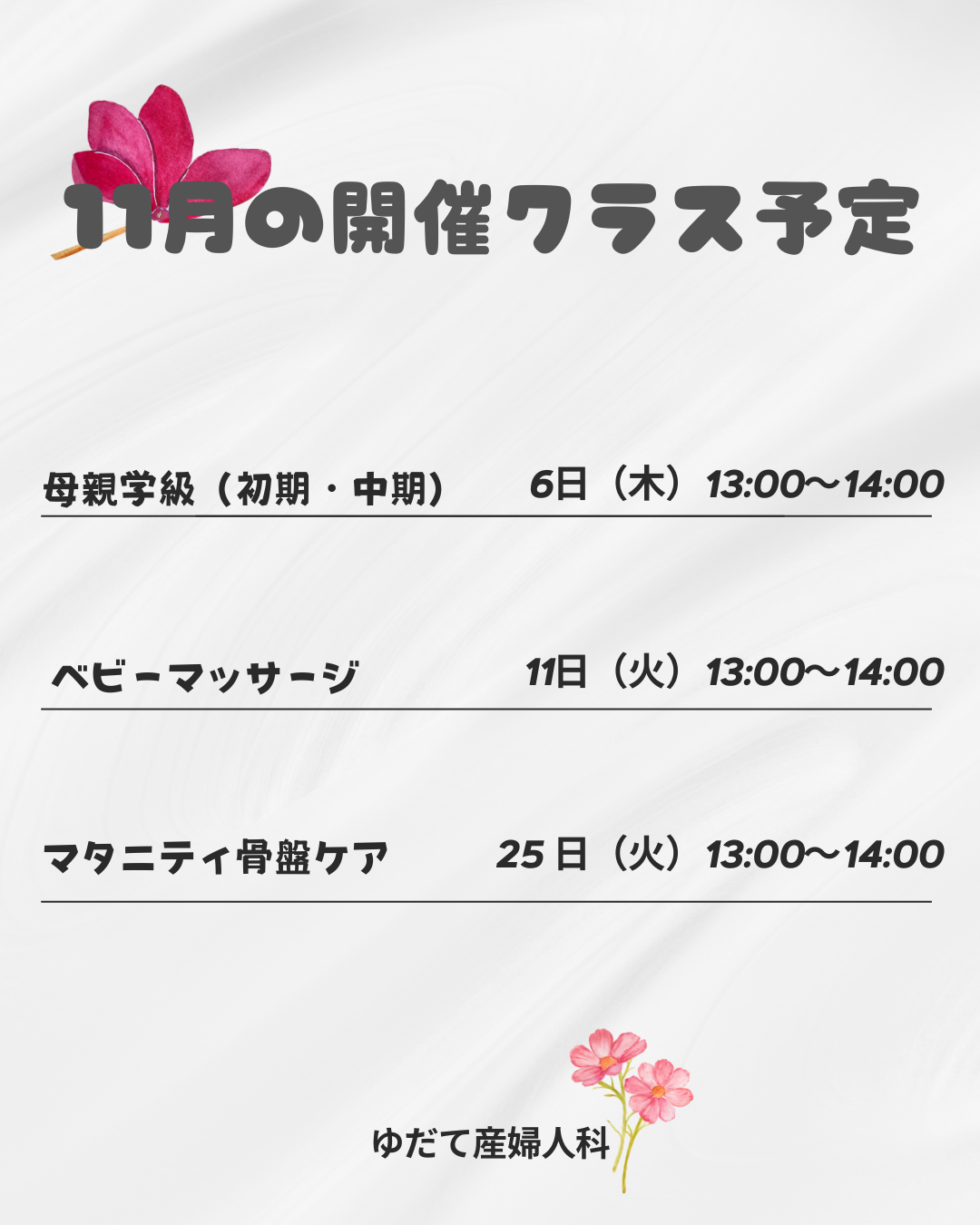 11月16日(日)には母親学級(後期・出産)クラスを開催致します。