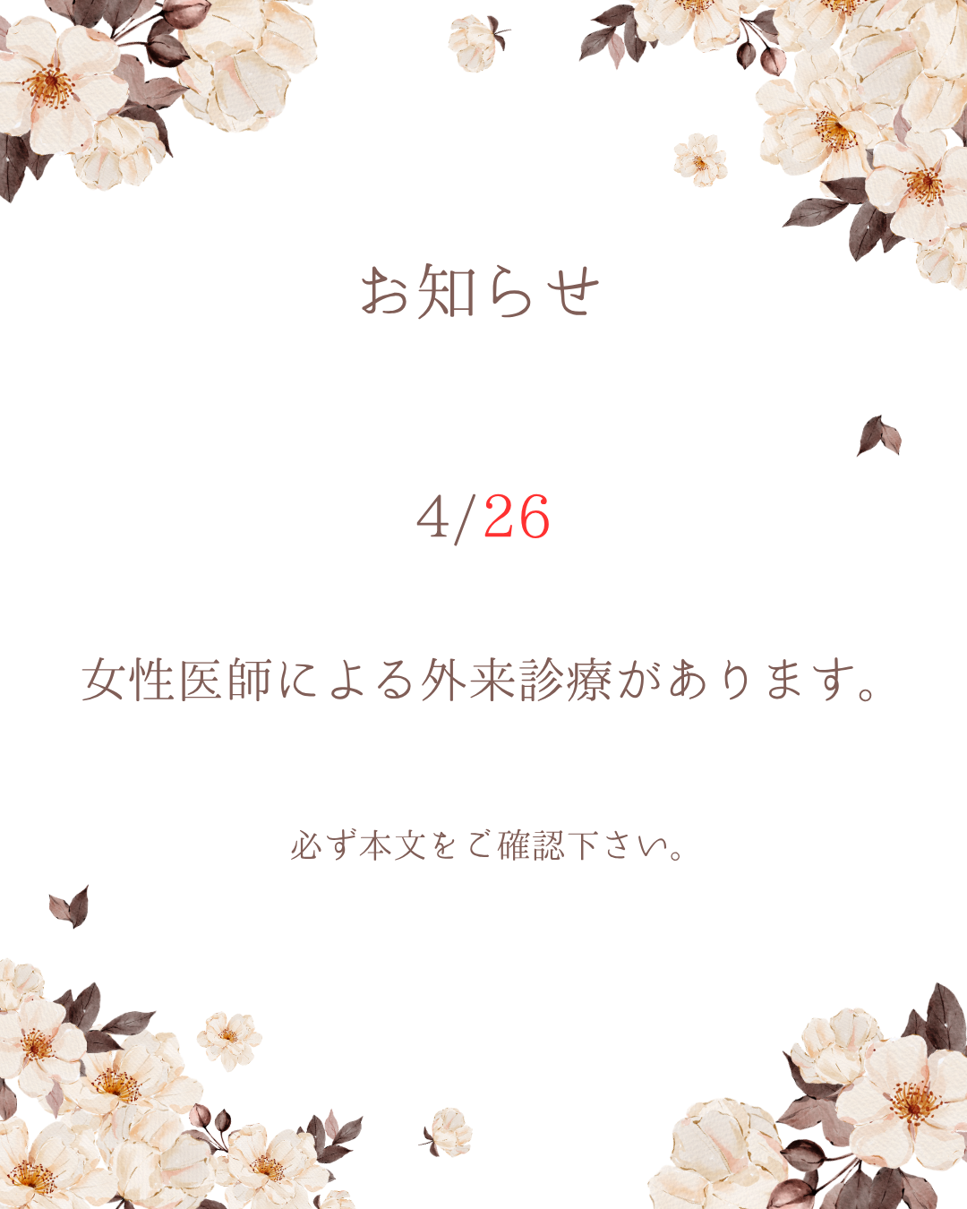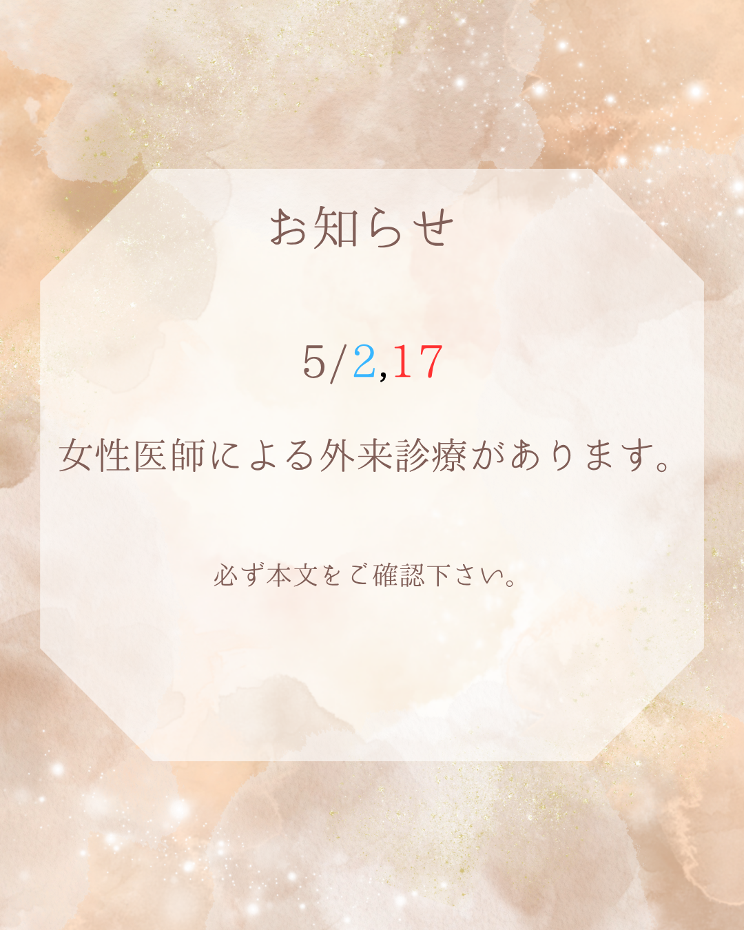 ※診療内容等により女性医師による診察が受けられない場合もございます。