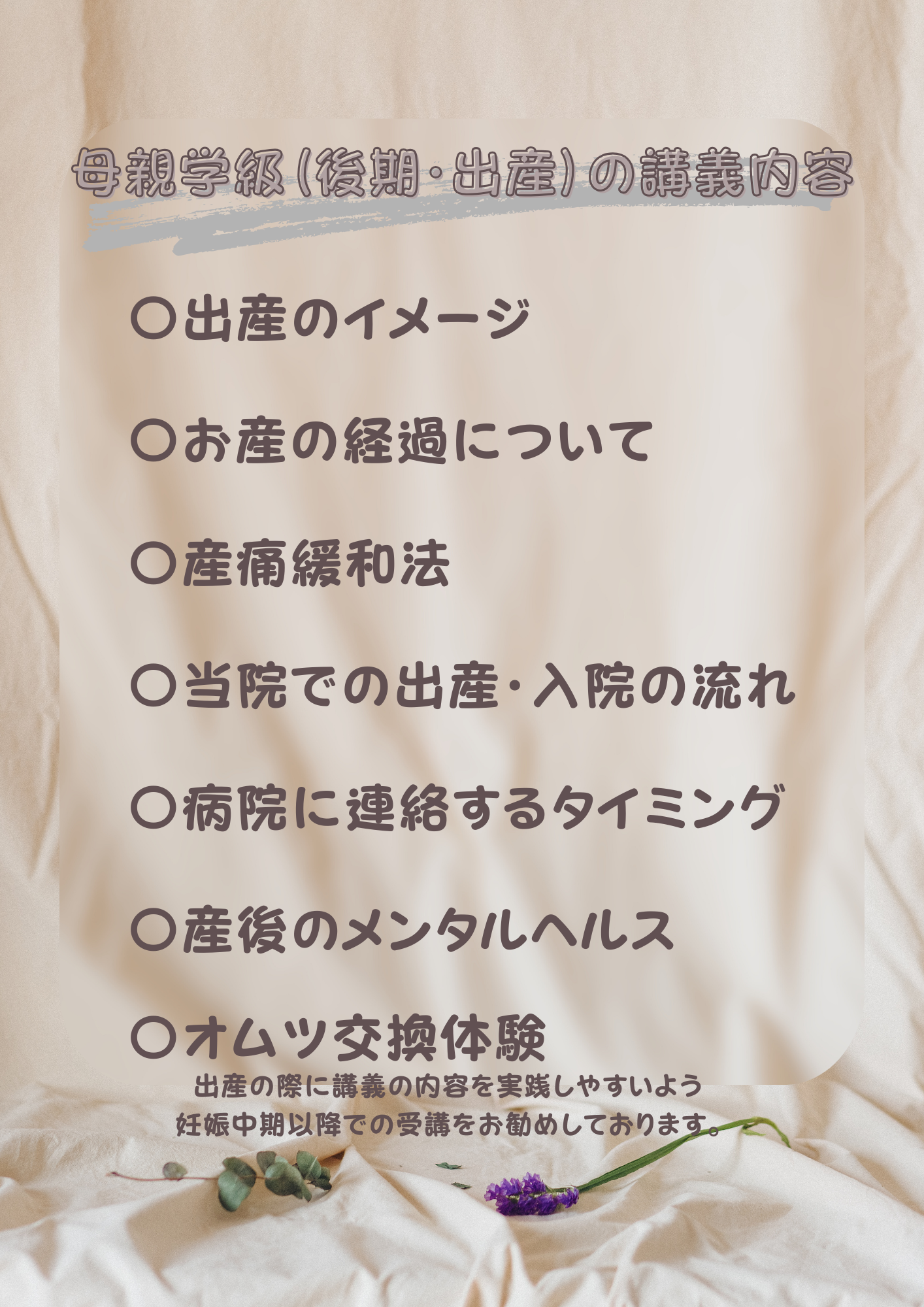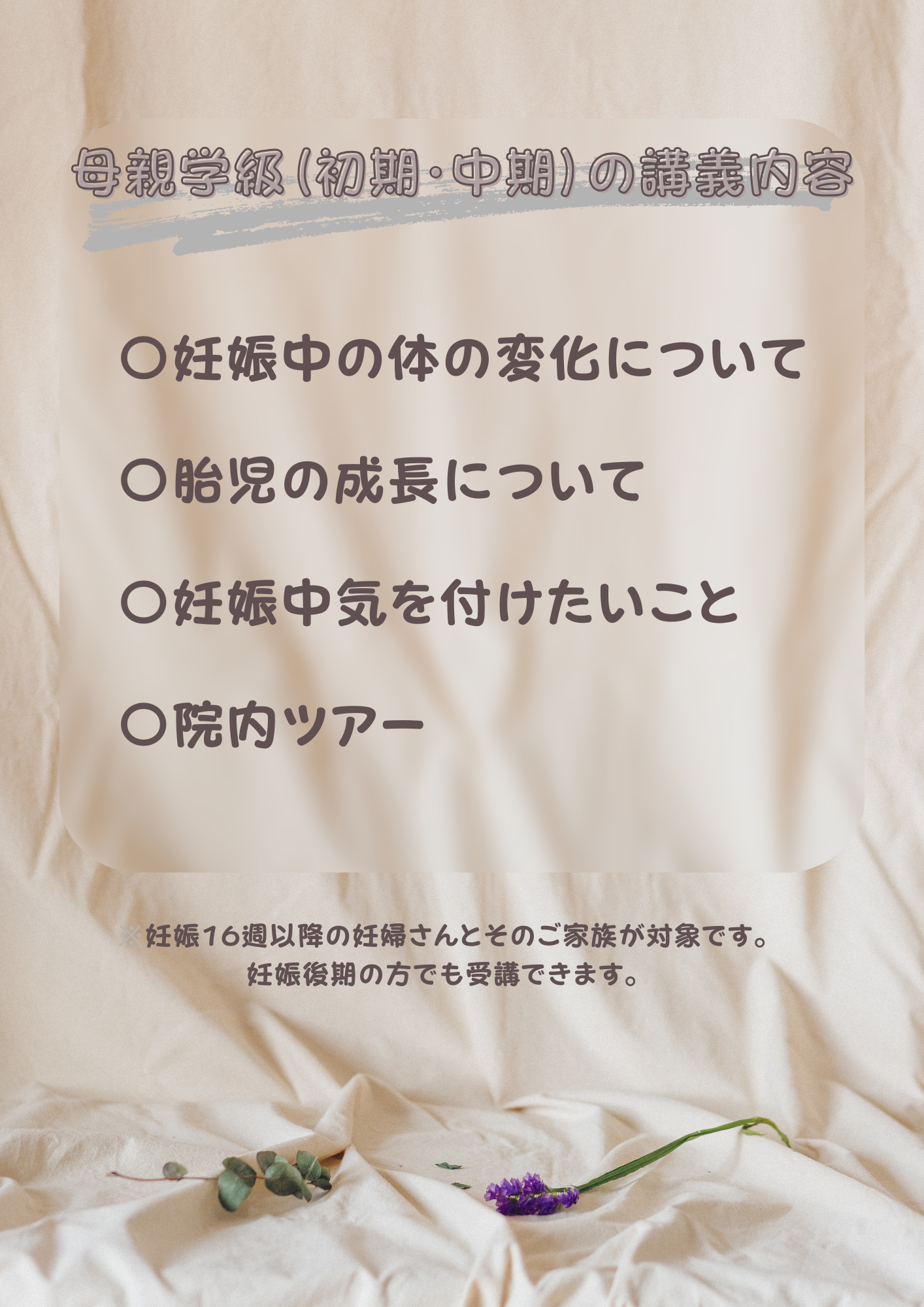 1月25日(日)には母親学級(後期・出産)クラスを開催致します。